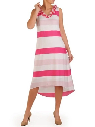 Asymetryczna sukienka w paski, kreacja z ozdobnym dekoltem i wiązaniem na plecach 28287