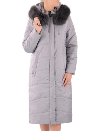 Kurtka zimowa damska, długa pikowana kurtka z kapturem i odpinanym futerkiem, szara, duże rozmiary 38622