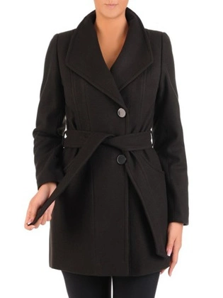 Płaszcz damski, elegancki, czarny płaszcz przejściowy z kołnierzem, wiązanie w pasie, kieszenie 27226