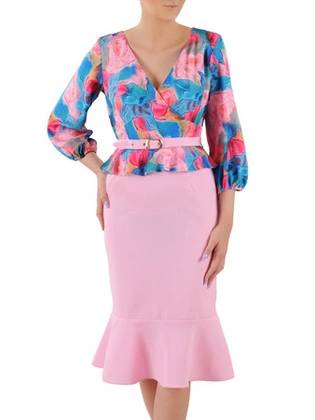 Efektowana sukienka z baskinką, kreacja w kwiaty 35936