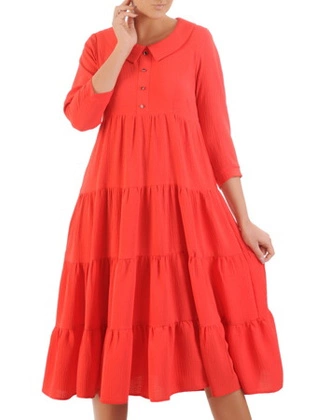 Rozkloszowana sukienka w kolorze pomarańczowym, kreacja z gumkami na rękawach 29160
