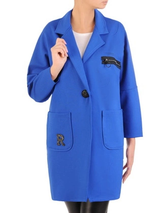 Płaszcz damski przejściowy, chabrowy, dzianinowy płaszcz z kołnierzem, ozdobny guzik, aplikacje, kieszenie, idealny na wiosnę, jesień 33144