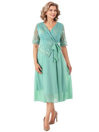 Elegancka zielona sukienka, kreacja ze wstawkami z koronki 28753