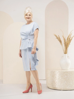 Niebieska sukienka wizytowa z efektowną baskinką 35883
