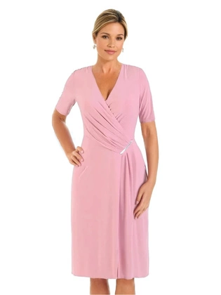 Pudrowa sukienka midi z ozdobnie wyciętym dekoltem 35311