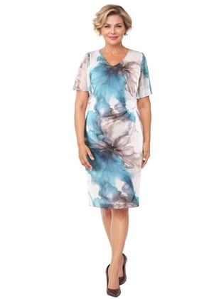 Sukienka midi w morskim kolorze z dekoltem serek i ozdobnym marszczeniem - elegancka kreacja na uroczystości rodzinne i przyjęcia 40050