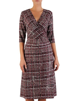 Prosta sukienka z kopertowym dekoltem, modna kreacja z oryginalnym nadrukiem 22235.