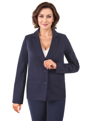 Granatowy żakiet damski z wiskozy, zapinany na guzik, z kieszeniami ozdobionymi zamkami 39619