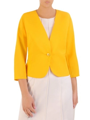 Żółte żakiety najlepiej prezentują się w towarzystwie neutralnych barw: granatu, grafitu, bieli oraz beżu. Dla odważniejszych pań polecamy połączenie z kolorem fuksji lub chabru, co stworzy nowoczesny i energetyczny look.