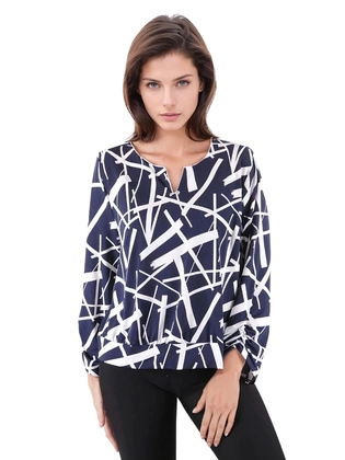Liczba produktów: 3153Bluzka damska, elegancka granatowa bluzka w modny wzór z ozdobnym dekoltem, duże rozmiary 39113