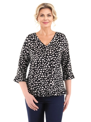 Liczba produktów: 3546Czarna bluzka damska we wzory z falbanami – elegancka bluzka wizytowa 39528