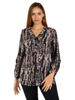 Liczba produktów: 3153Czarno-beżowa bluzka plus size z wiskozy – zwierzęcy wzór, dekolt w serek, elegancki model z rękawem 3/4 40807