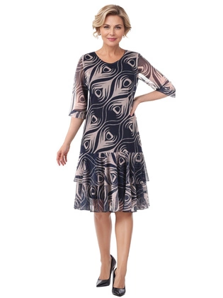 Beżowa sukienka midi z ozdobnym dekoltem - rozkloszowana, elegancka propozycja na wesele 39991