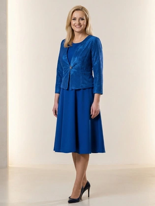 Liczba produktów: 3523Elegancki chabrowy komplet na wesele i komunię – rozkloszowana sukienka midi + żakiet z ozdobnym guzikiem, idealny dla 50+ 39504