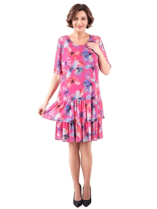 Zwiewna różowa sukienka tiulowa midi z falbanami – trapezowy fason, dekolt w serek, elegancka na lato 39767
