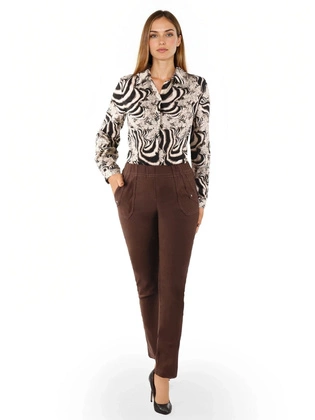 Liczba produktów: 1134Spodnie, brązowe, dopasowane spodnie damskie z gumką w pasie i przednimi kieszeniami, duże rozmiary 34888
