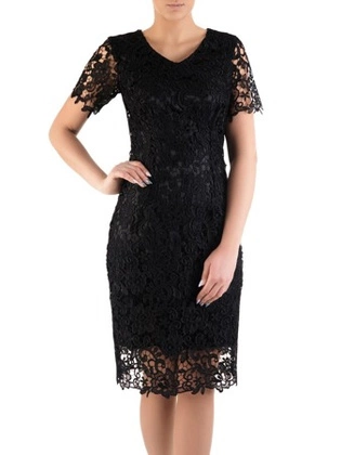 Sukienka wykończona koronką 15747, kreacja z modnym dekoltem.
