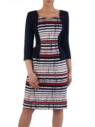 Liczba produktów: 10713Modna sukienka z baskinką 15869, elegancka kreacja w marynarskie paski.