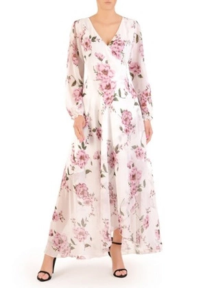 Sukienka damska 17597, długa kreacja w wyszczuplającym wzorze.