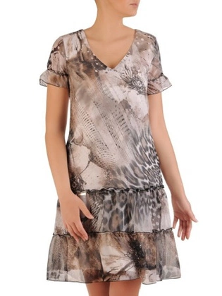Luźna sukienka z ciekawym nadrukiem, modna kreacja wykończona szyfonem 21113